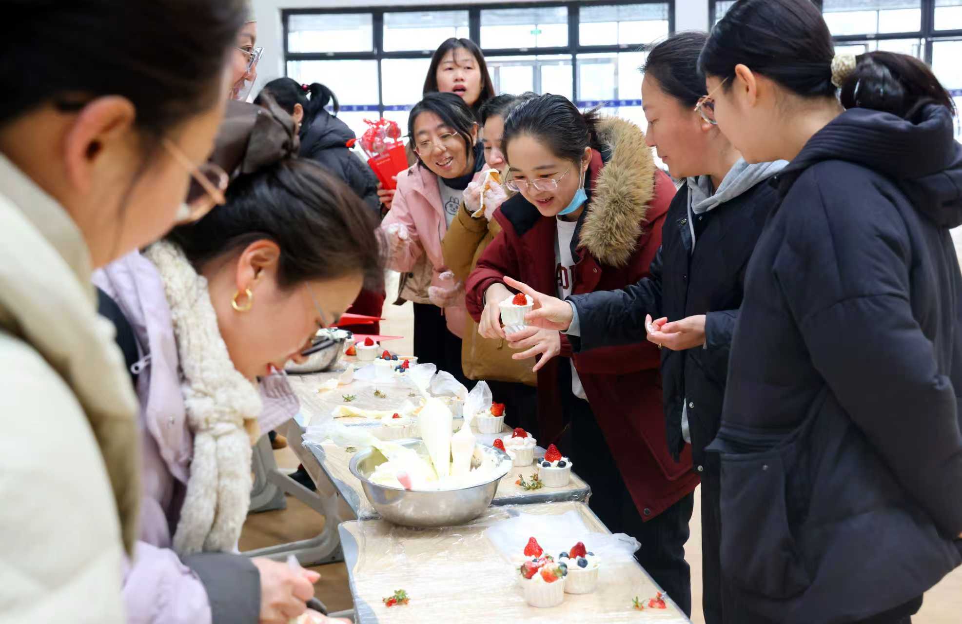 活动现场洋溢着欢乐温馨的氛围。学院党委副书记魏全红、副院长董坤景出席了此次活动,与女教职工们一起,戴上手套,揉面、塑形、点缀……食品与生物工程系中式面点工作室教师武玉涛首先为大家讲解了花馍的历史渊源和制作技巧,并现场演示了花馍的造型手法与蛋糕的制作要领。在老师的指导下,一个个色彩鲜艳、造型各异的花馍逐渐成型,精致可爱的小蛋糕也陆续出炉。大家互相交流制作心得,拍照记录下自己的“匠心之作”,现场欢声笑语不断。 “平时忙于教学工作,很少有机会静下心来体验这样的手工活动。今天不仅学会了制作花馍,还收获了专属的节日礼物,感觉特别温暖。”一位参与活动的女教师捧着亲手制作的花馍开心地说。