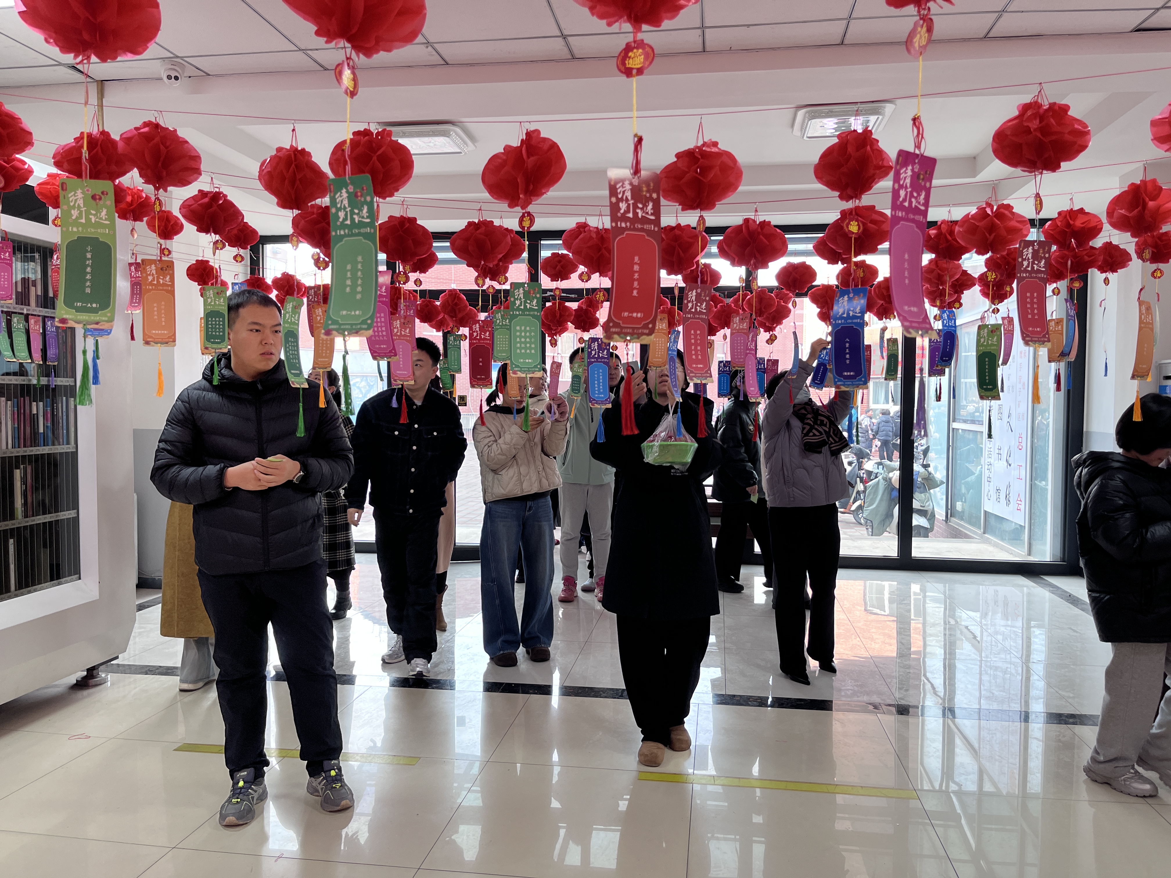 活动现场张灯结彩,处处洋溢着浓浓的节日气息。一串串火红的灯笼和一条条彩纸制成的谜语悬挂整齐,谜语内容涵盖传统文化、生活常识、字词成语、本地风物等,兼具知识性与趣味性,吸引了众多职工热情参与。大家或驻足凝思,或低声讨论,或豁然开朗后欣喜揭谜,场面热烈而有序,传统节日的文化魅力在轻松愉快的猜谜过程中得到了生动展现。